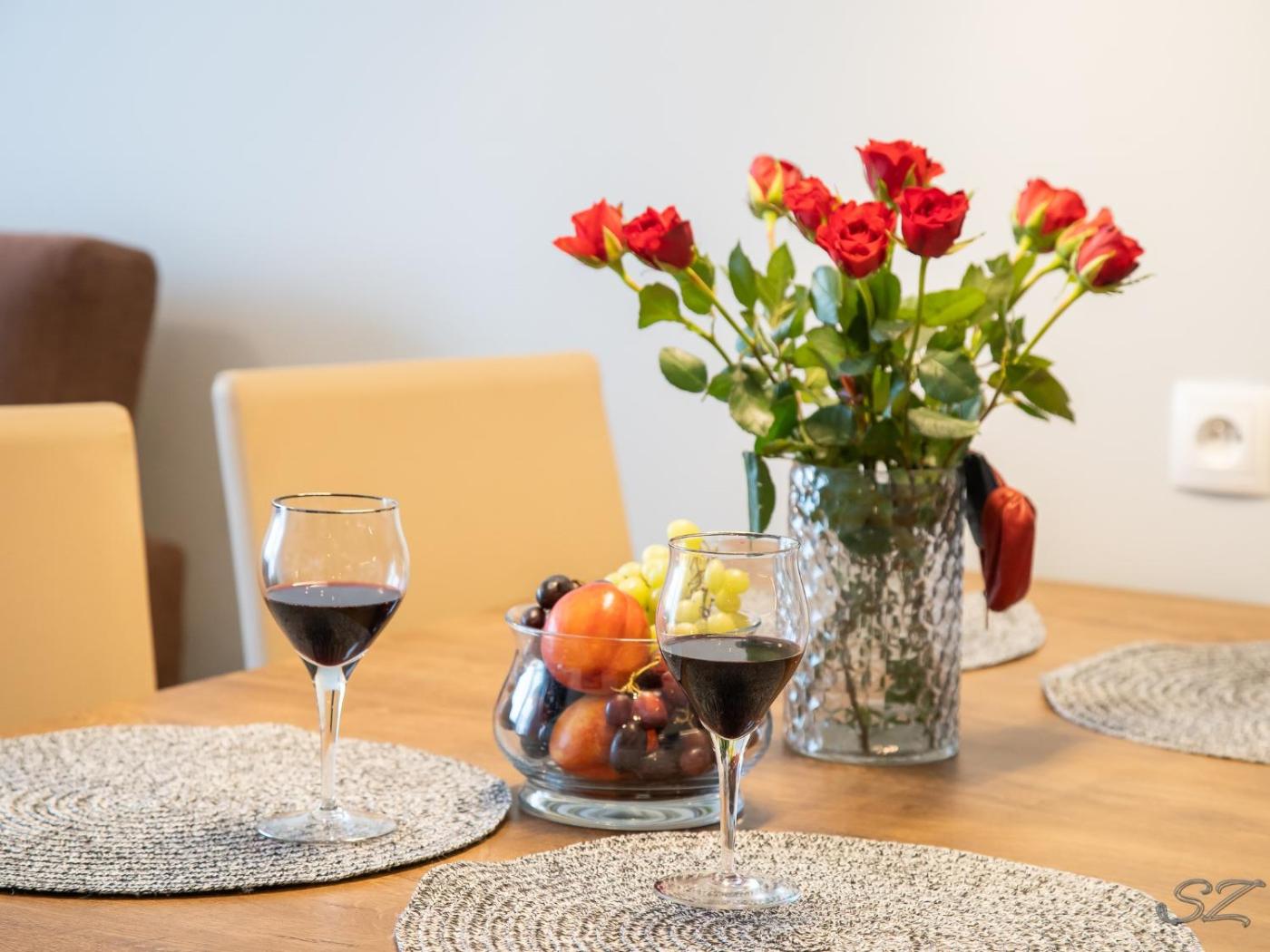 Oferta apartamentu obejmuje sypialnię (1), salon, kuchnię z pełnym wyposażeniem, w tym lodówką i ekspresem do kawy, a także łazienkę (1) z prysznicem oraz suszarką do włosów. W apartamencie zapewniono ręczniki i pościel.