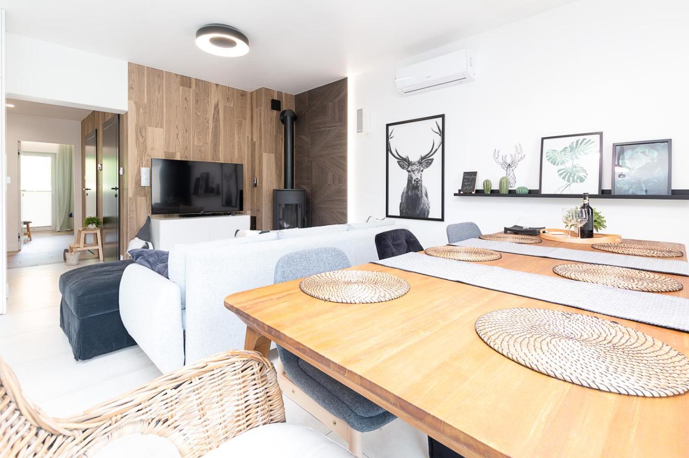 Apartament typu Deluxe. Guests will have a special experience as this apartment features a fireplace. Featuring a private entrance, this air-conditioned apartment is comprised of 1 living room, 2 separate bedrooms and 2 bathrooms with a walk-in shower and a hairdryer. The well-fitted kitchen features a stovetop, a refrigerator, a dishwasher and kitchenware. The spacious apartment offers a washing machine, a tea and coffee maker, a seating area, a flat-screen TV with streaming services, as well as garden views. The unit offers 4 beds. Apartament - 6 osobowy. Powierzchnia pokoju ok.: 70 mkw.